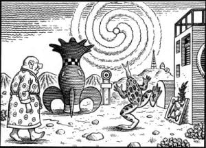 Jim Woodring (f. 1952) har fra tidlig 80-tall opparbeidet seg status som en av de mest innflytelsesrike nyere serieskaperne. Likevel er hans unike surrealistiske stil ulikt alt annet som finnes av tegneserier. Woodrings verden kombinerer drøm og virkelighet, det groteske og det vakre med en personlig humor. I nyere tid har Woodring også ført figurene sine videre til andre medier som leketøy, animasjon og malekunst, samtidig som han har laget færre tegneserier. Værverk (Weathercraft) kom høsten 2009, og er et 100 siders overflødighetshorn av inspirerte innfall. Historien involverer en rekke av Woodrings gjennomgangsfigurer; Manhog, Frank, Pupshaw m.fl. og plasserer seg blant høydepunktene i katalogen hans. Værverk er et skremmende, engasjerende, morsomt mareritt i svart-hvitt technicolor.